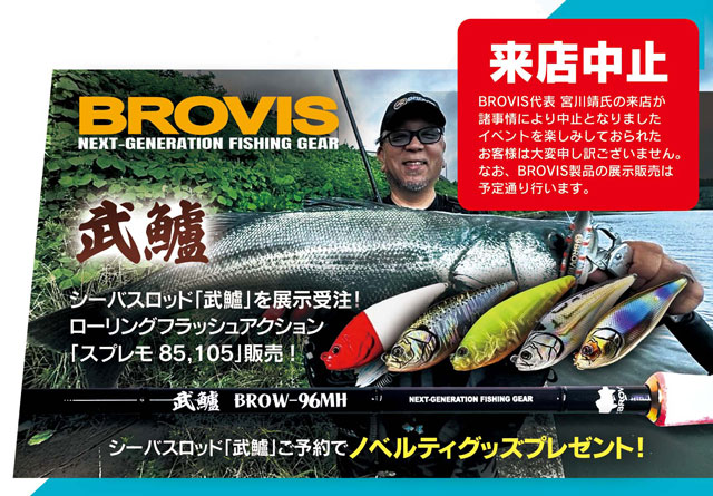 ブロビスシーバスロッド「武鱸」を展示受注!ローリングフラッシュアクション「スプレモ85、105」販売!シーバスロッド武鱸ご予約でノベルティグッズプレゼント