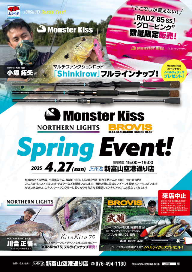 “怪魚ハンター”こと小塚拓矢氏が率いるフィッシングブランドモンスターキスより、ここでしか買えない「RAUZ85SS“グローピンク”」を数量限定販売!さらにマルチファンクションモバイルロッドShinkirow(シンキロウ)をフルラインナップで展示します!