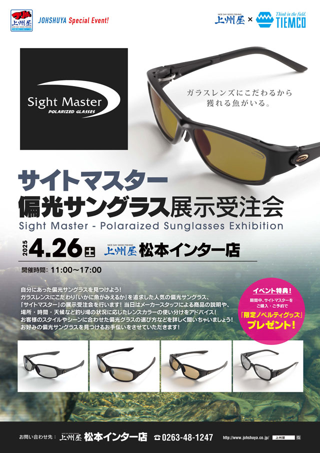 2025年4月26日(土)11:00~17:00、上州屋松本インター店にてティムコ社「サイトマスター」偏光グラスの展示受注会を開催します。
