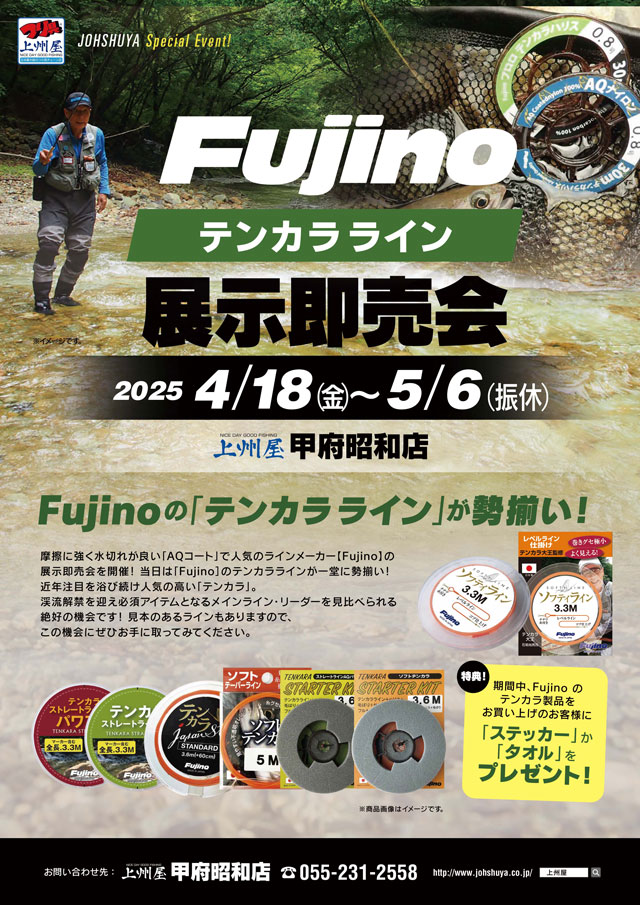 2025年4月18日(金)~5月6日(火・の期間中、上州屋甲府昭和店にてフジノライン、テンカララインの展示即売を開催します!