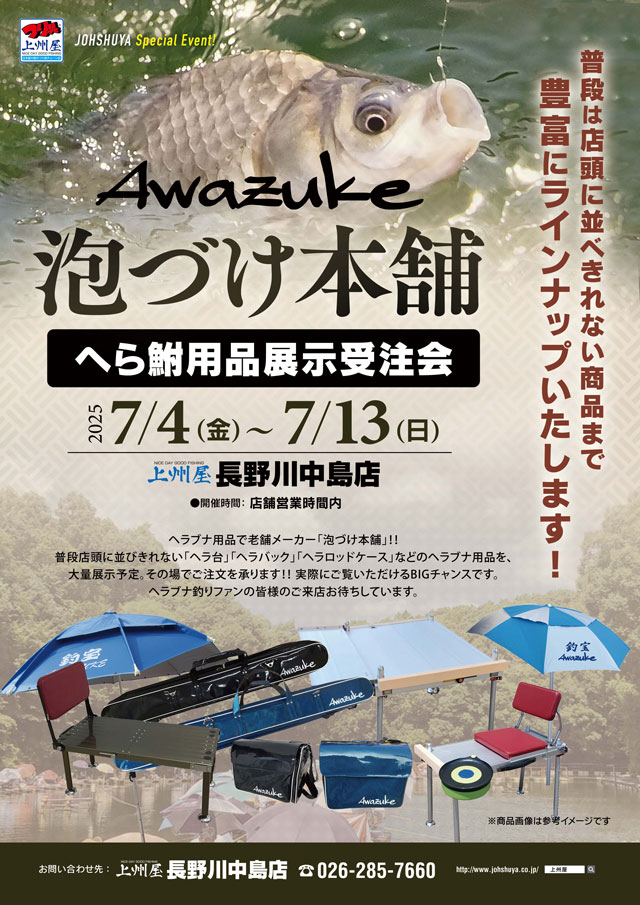 2025年7月4日(金)~13日(の10日間、上州屋長野川中島店にて泡づけ本舗“へら鮒用品”の展示受注会を開催します。