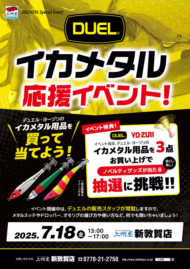 2025年7月18日(金)13:00~17:00、上州屋新敦賀店にてDUELデュエル、イカメタル応援イベントを開催します!