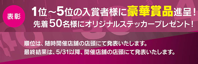 ※順位は随時開催店舗店頭に掲示します。最終結果は5/31以降、開催店舗の店頭で発表します。