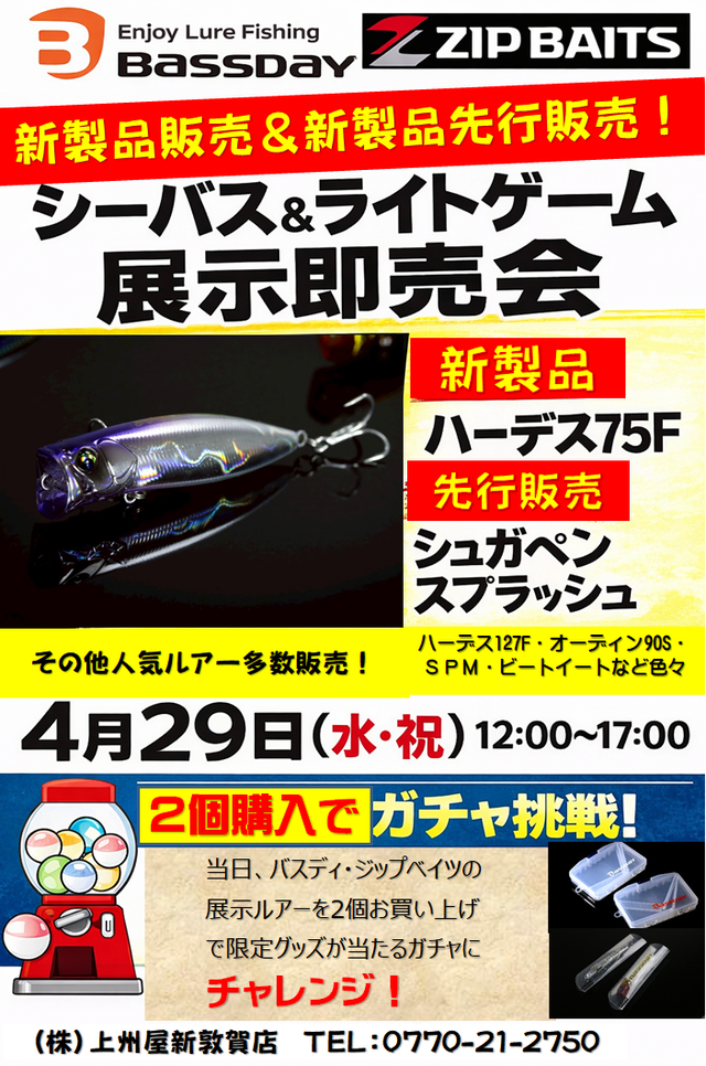 2026年4月29日(水・祝)12:00~17:00、上州屋新敦賀店にてバスデイ&ジップベイツのライトゲーム、シーバスルアー販売会を開催します!