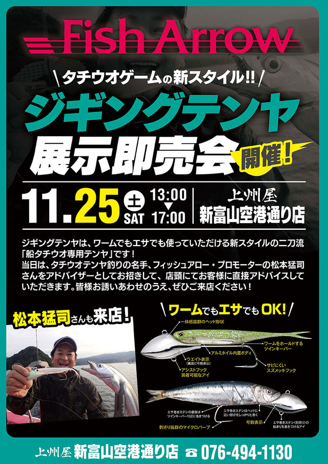 2017年11月25日(土)13:00~17:00(予定)、上州屋新富山空港通り店にてFishArrow(フィッシュアロー)ジギングテンヤ展示即売会開催します!当日はタチウオテンヤ釣りの名手、フィッシュアロー・プロモーター松本猛司さんが店頭アドバイザーとして来店!直接のアドバイスも受けられます!