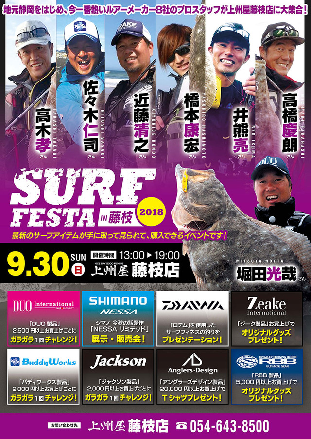 2018年9月30日(日)13:00~19:00、上州屋藤枝店に地元静岡をはじめ人気ルアーメーカー8社のプロスタッフが大集合!“サーフフェスタ2018in藤枝”を開催致します!