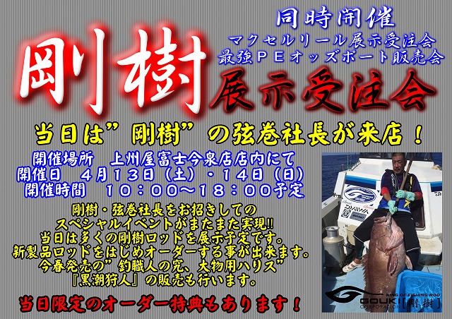 なんと剛樹の弦巻社長が来店!直接剛樹ロッドについて色々聞けるまたとないチャンス!当店スタッフですら初めて見る竿やカラーを色々持ってきて頂ける予定です!今春発売の“釣職人の究、大物用ハリス”『黒潮狩人』の販売も行います。この機会をお見逃しなく!