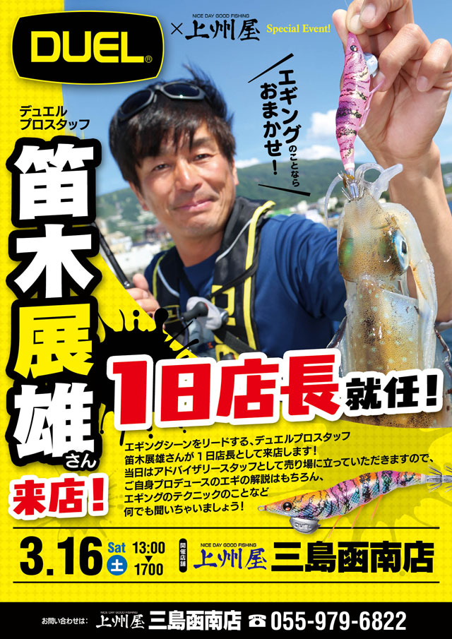 2019年3月16日(土)13:00~17:00(予定)、DUEL(デュエル)プロスタッフ笛木展雄さんが上州屋三島函南店に来店!当日はエギング1日店長として売場に立っていただきますので、“アオリーQエース3.5”“ダートマスターラトル3.5”“イージーQキャスト喰わせ3.5”など2019年注目の新製品エギの解説はもちろん、テクニックやカラーローテーションの事など何でも聞いてしまいましょう!