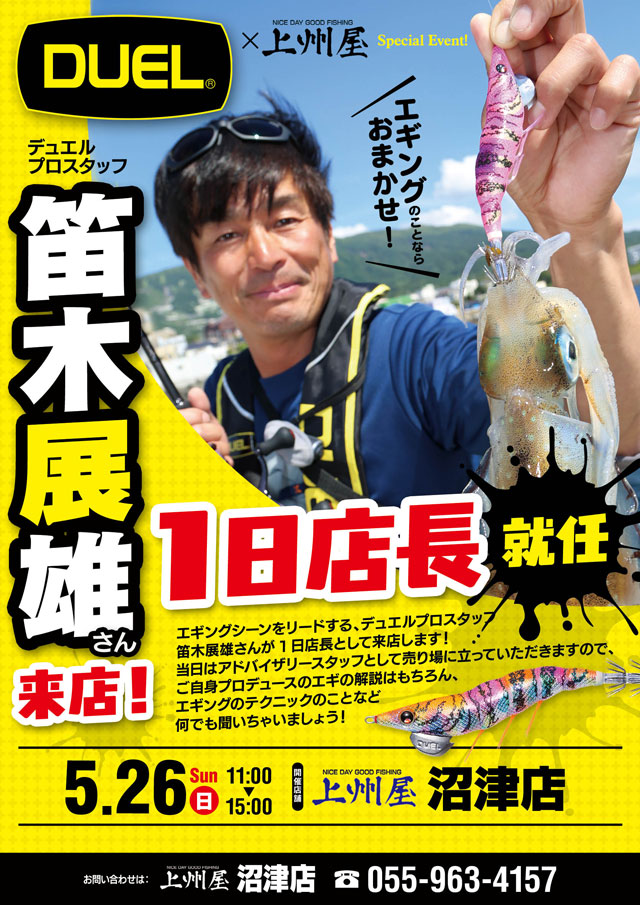 2019年5月26日(日)11:00~15:00(予定)、DUEL(デュエル)プロスタッフ笛木展雄さんが上州屋沼津店に来店!当日はエギング1日店長として売場に立っていただきますので、“アオリーQエース3.5”“ダートマスターラトル3.5”“イージーQキャスト喰わせ3.5”など2019年注目の新製品エギの解説はもちろん、テクニックやカラーローテーションの事など何でも聞いてしまいましょう!