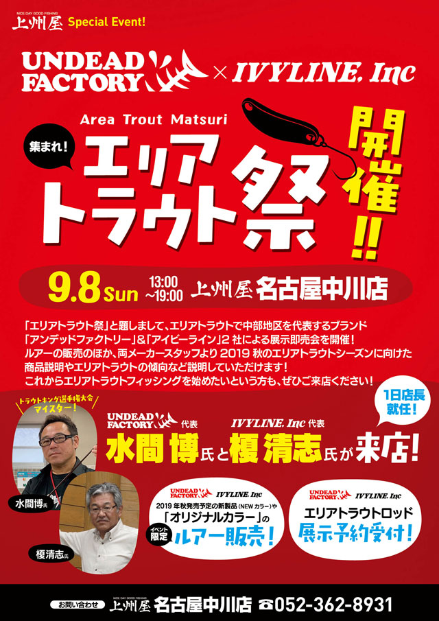 2019年9月8日(13:00~19:00(予定)上州屋名古屋中川店にて「エリアトラウト祭」開催!中部地区を代表するブランド“アンデッドファクトリー”代表:水間博氏と、“アイビーライン”代表:榎清志氏が共に1日店長に就任し、2社による合同展示即売会を開催します!