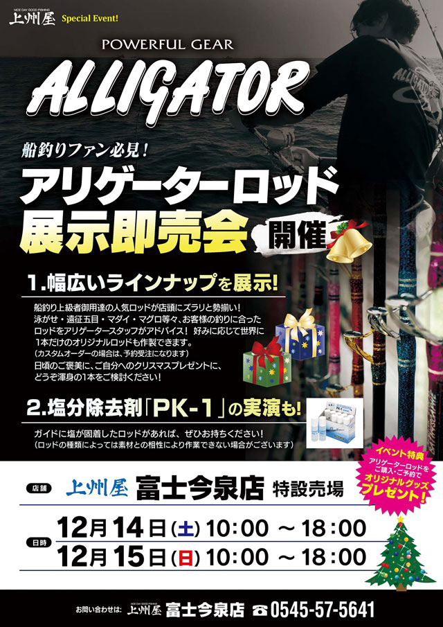 上州屋富士今泉店にてグラスワンピースロッドの元祖、アリゲーターロッドの展示即売会を開催します!