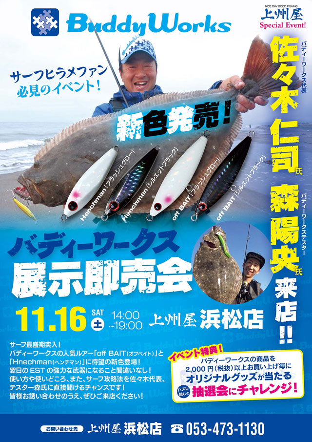 2019年11月16日(14:00~19:00(予定)上州屋浜松店にてサーフヒラメイベント開催!バディーワークス代表、佐々木仁司さん、テスター森陽央さんが来店しての人気製品展示即売会を開催します!
