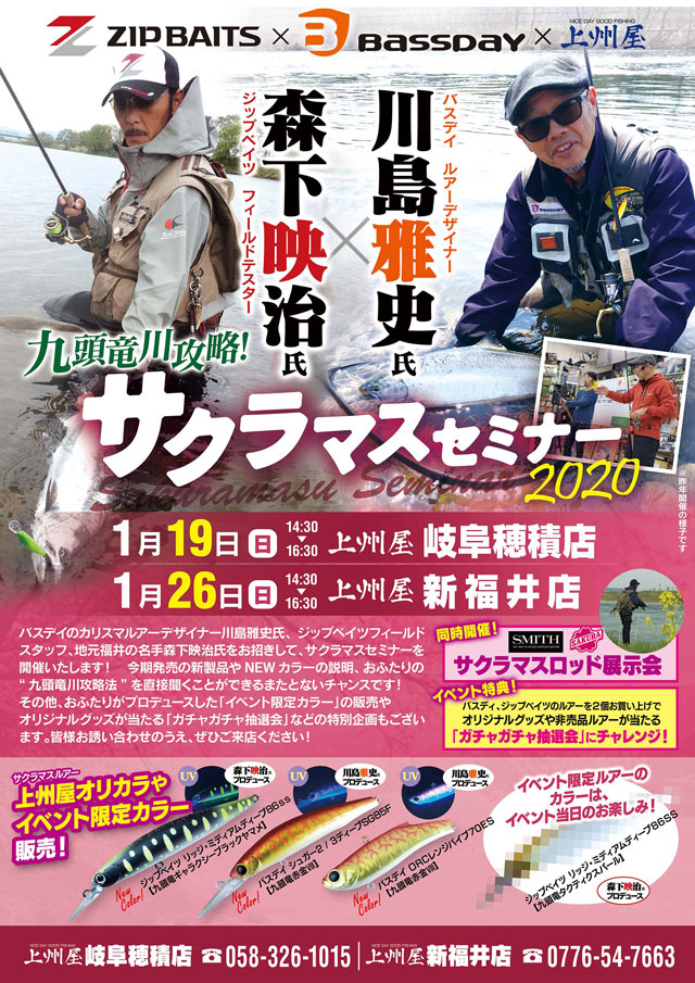 2020年1月19日(日)14:30~16:30(予定)上州屋岐阜穂積店にバスデイ・ルアーデザイナー川島雅史さん&ジップベイツ・フィールドテスター森下映治さんが来店!2020サクラマス攻略セミナー開催します!