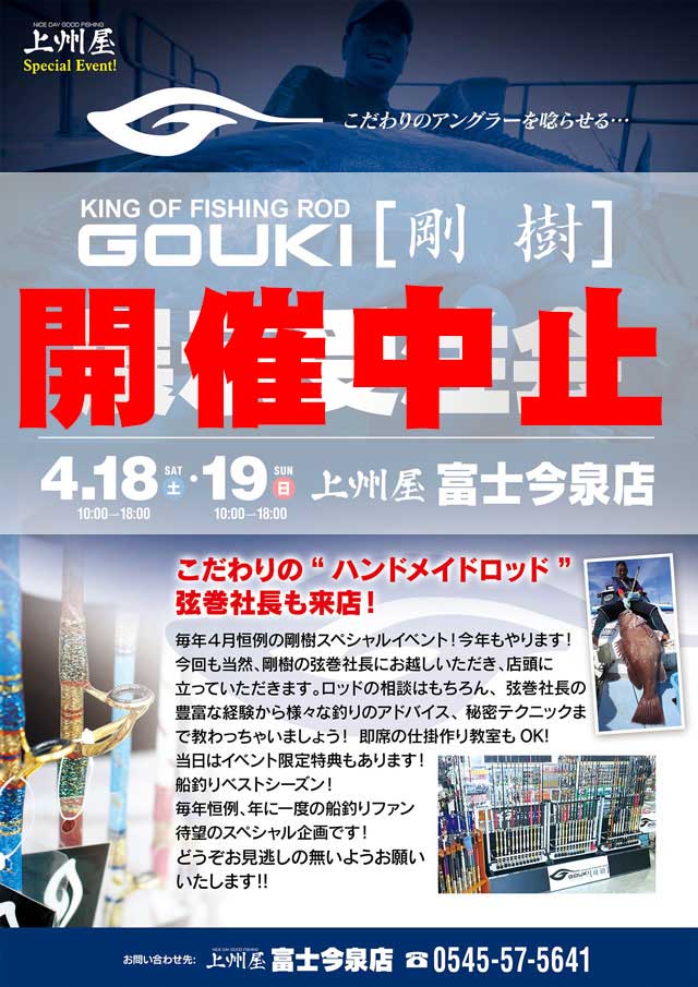 2020年4月18日()および19日()上州屋富士今泉店にて開催を予定しておりました「ハンドメイドロッド剛樹展示受注会」は、この度の緊急事態宣言発令に伴い、開催を中止させていただくことになりました。