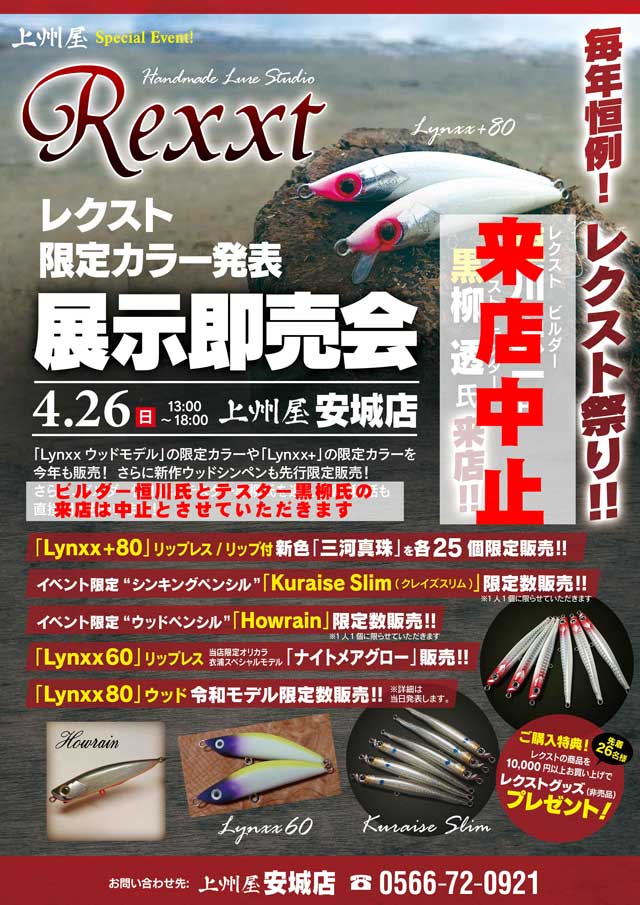イベント縮小|来店中止【安城店】三河発のルアーブランド“レクストルアー”限定カラー即売会