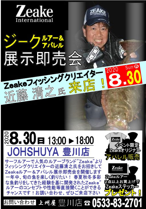 2020年8月30日(日)13:00~18:00(予定)、上州屋豊川店にZeake(ジーク)フィッシングクリエイター近藤清之さんが来店!同社のルアー&アパレル展示即売会を開催します!