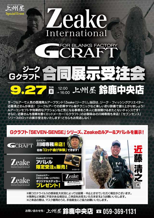 2020年9月27日(12:00~16:00予定、上州屋鈴鹿中央店にてZeakeジーク&Gcraftジークラフト合同展示受注会を開催します!