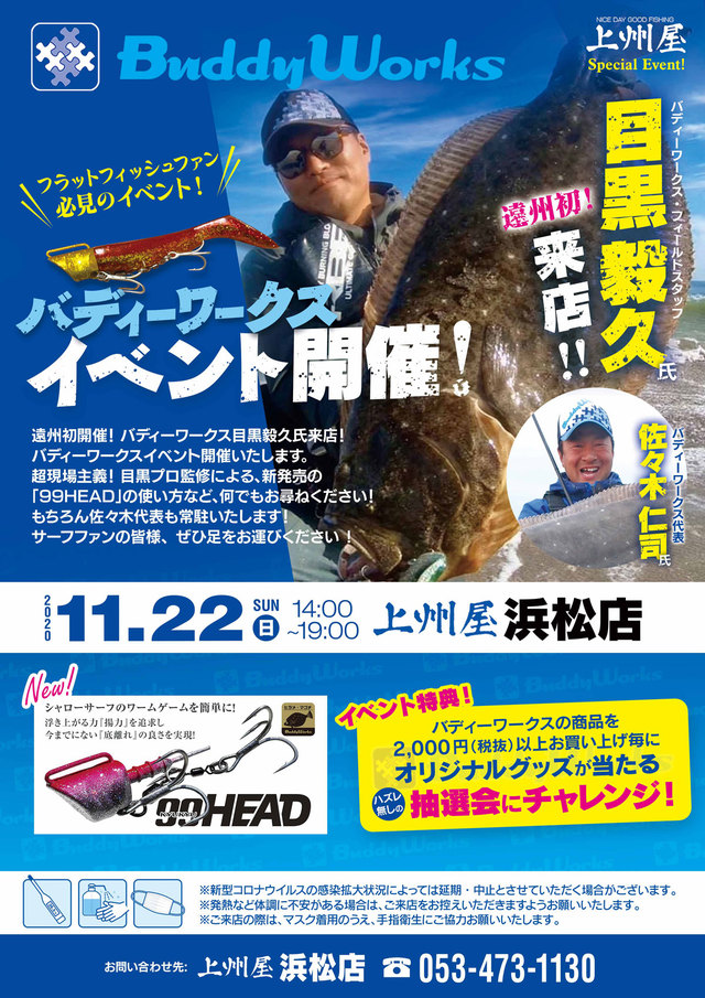 2020年11月22日(日)14:00~19:00(予定)上州屋浜松店にバディワークス代表佐々木仁司さんと、フィールドスタッフ目黒毅久さんが来店!フラットフィッシュ攻略店頭イベントを開催します!