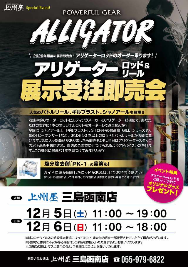 上州屋三島函南店にてグラスワンピースロッドの元祖、アリゲーターロッドの展示即売会を開催します!