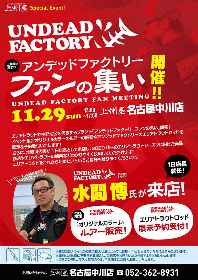 2020年11月29日(日)13:00~17:00予定、上州屋名古屋中川店にて中部地区を代表する人気ブランド“アンデッドファクトリー”の水間博氏をお招きして、エリア・トラウト店頭イベントを開催します!