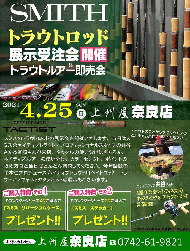 2021年4月25日(日)12:00~17:00(予定)、上州屋上州屋奈良店にてスミス ネイティブトラウトロッドの展示会&トラウトルアー即売会を開催します。スミスのネイティブマスターの営業マン、井谷さん&尾崎さんも来店予定!
