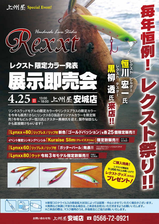 2021年4月25日(13:00~18:00(予定)、上州屋安城店にて三河発のルアーフィッシングブランド“レクスト祭り”開催!限定カラー発表&即売会を開催!(※10:00より整理券を配布します)