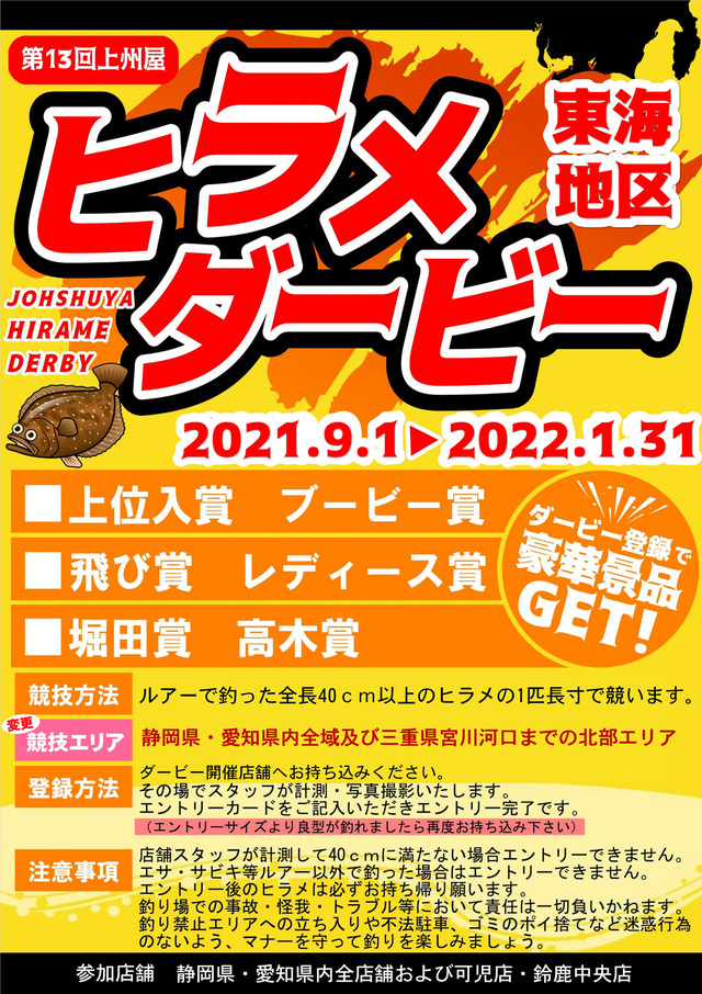 2021年9月1日(水)~2022年1月31日(月)の期間中、静岡・愛知県内の上州屋各店および可児店鈴鹿中央店にて【東海地区】第13回上州屋ヒラメダービーを開催します!