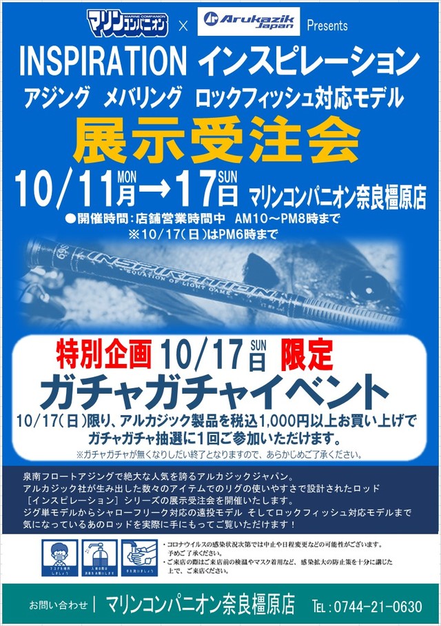 2021年10月11日(月)~17日(の期間中、マリンコンパニオン奈良橿原店にてアルカジックジャパン社の人気ロッド「インスピレーション」シリーズの展示受注会を開催、ジグ単モデルからシャローフリーク専用の遠投モデル、ロックフィッシュモデルなど、様々なモデルを実際に手に持ってご覧いただけます。