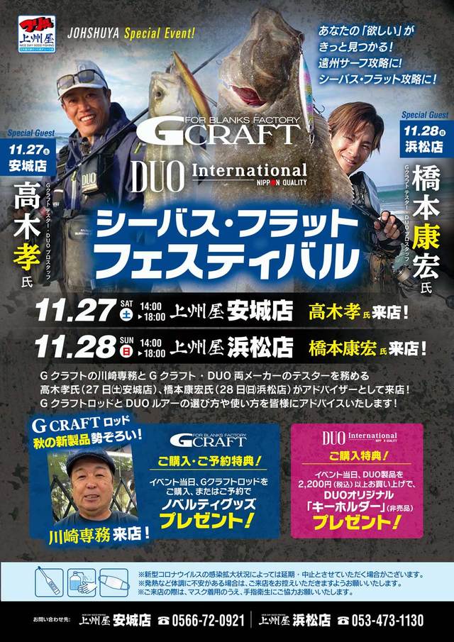 2021年11月27日(土)14:00~18:00(予定)、上州屋安城店にGクラフトの川崎専務と、Gクラフト・DUO両メーカーのテスターを務める高木孝氏が来店!シーバス・フラット フェスティバル開催します!