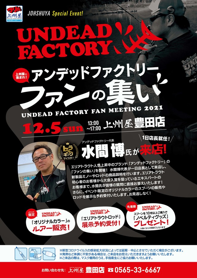 2021年12月5日(13:00~17:00予定、上州屋豊田店にて中部地区を代表する人気ブランド“アンデッドファクトリー”の水間博氏をお招きして、エリア・トラウト店頭イベントを開催します!