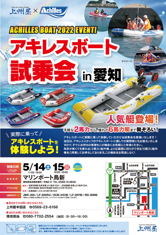 上記2日間、愛知県知多郡武豊町「マリンポート鳥新」」にて、免許不要ボートの購入を検討されているお客様に、アキレスボートに実際乗っていただき体験していただくための試乗会を実施いたします。