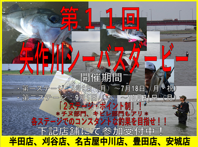 上記日程「2ステージ・ポイント制」で、矢作川でルアーにて釣り上げたシーバスの釣果(2ステージでのポイント数)を競うフォトダービーです!チヌ部門、キビレ部門(1匹の長寸を競う)もあります。