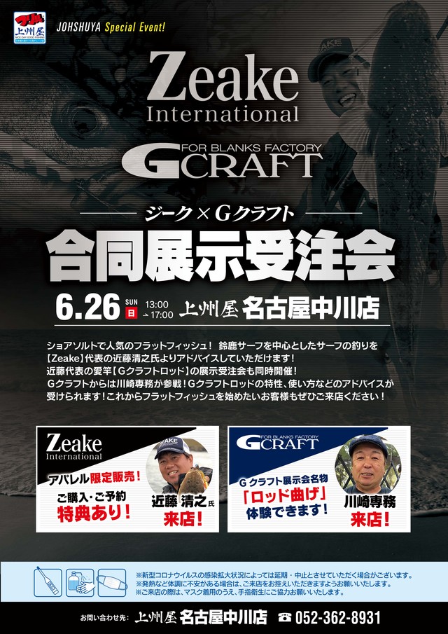 2022年6月26日(日)13:00~17:00(予定)、上州屋名古屋中川店にてZeakeジーク&Gcraftジークラフト合同展示受注会を開催します!