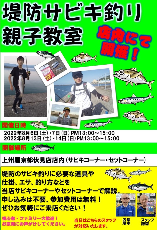 2022年8月6日(土)&7日(日)の2日間(開催時間13:00~15:00)、上州屋京都伏見店にて堤防サビキ釣り親子教室を店頭開催いたします!