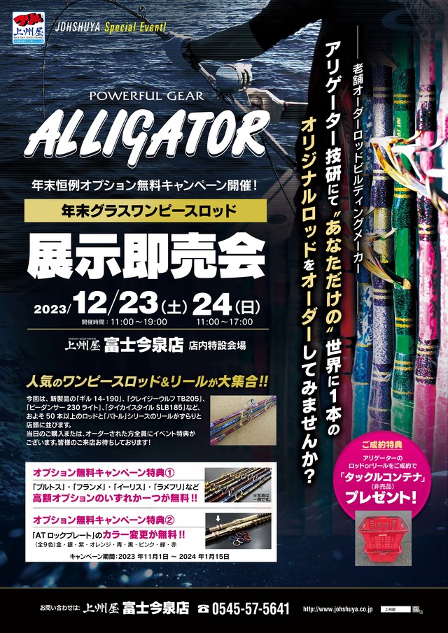 気に入った商品があれば即売OK!その場に無い仕様が御希望ならフルオーダーも可能です!今回イベントにてアリゲーターのロッドorリールをご成約で「タックルコンテナ」プレゼント!