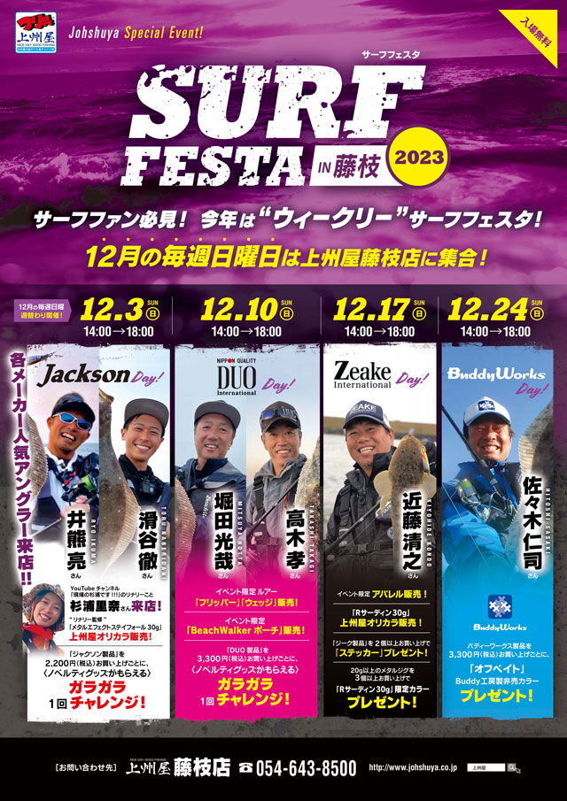 サーフファン必見!2023年12月は上州屋藤枝店にて“ウィークリー”サーフフェスタ開催!12月の毎週日曜日、各メーカーの人気アングラー達が週替わりで来店&店頭イベント開催します!