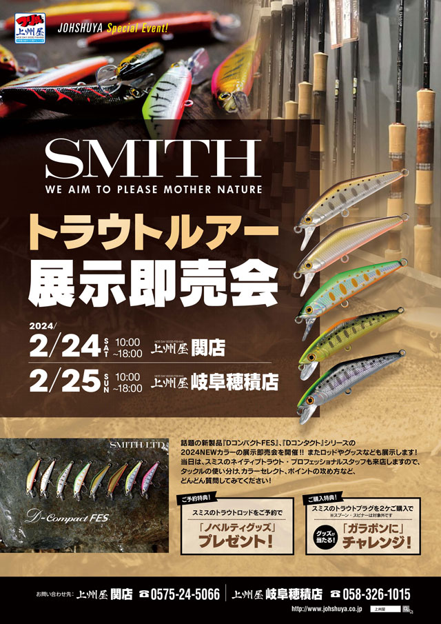 2024年2月24日(土)10:00~18:00、上州屋関店にてSMITH|スミス、トラウトルアー展示即売会を開催します!
