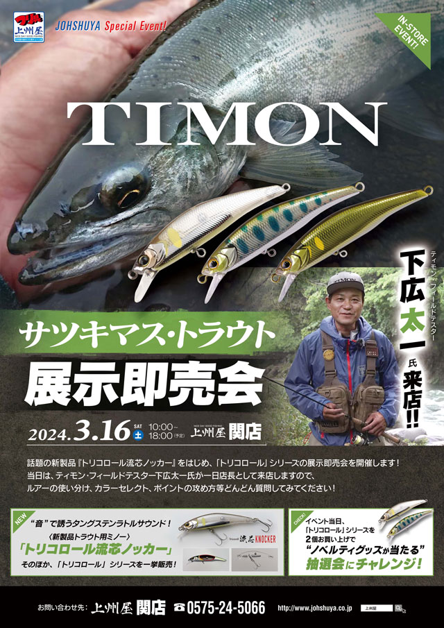 【関店】TIMONティモン・サツキマス&トラウト展示即売会!下広太一テスター来店!