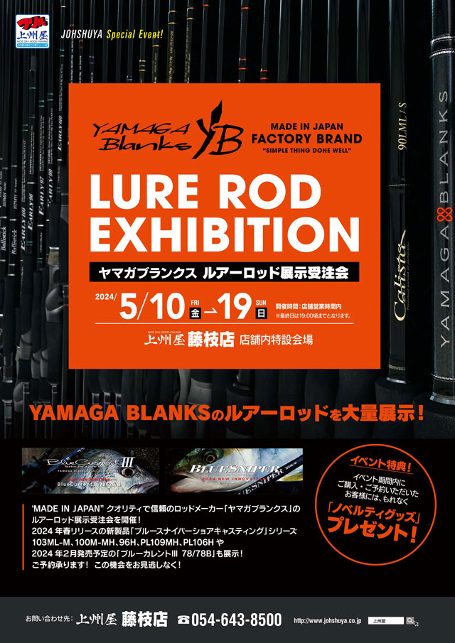 2024年5月10日(金)~19日(日)の10日間、上州屋藤枝店にてヤマガブランクス社製、ルアーロッドの展示受注会を開催します!