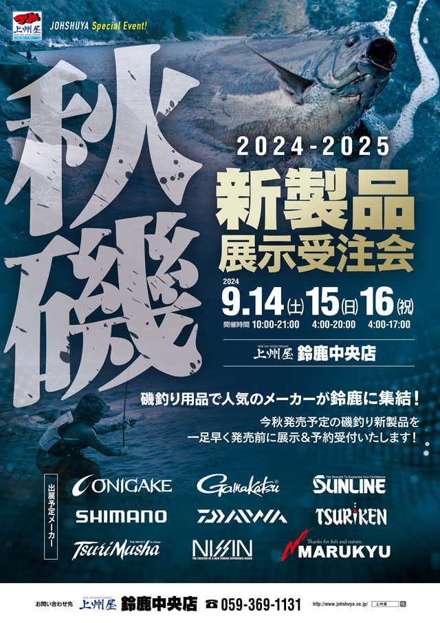 2023年9月14日(土)、15日(日)、16日(月/祝)の3日間、上州屋鈴鹿中央店にて2024‐2025“秋磯”新製品展示受注会を開催します!