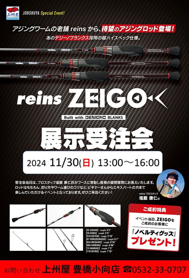 2024年11月30日(日)13:00~16:00、上州屋豊橋小向店にreins(レイン)プロスタッフ塩飽康仁さんが来店!アジングを始めライトソルトワームの人気ブランド、レインから登場した至極のアジングロッド『ZEIGO』の展示受注会を開催します!