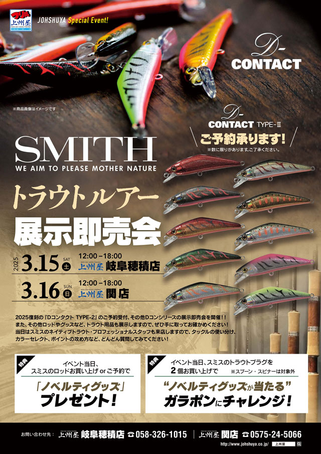 2025年3月15日(土)12:00~18:00、上州屋岐阜穂積店にてSMITH|スミス、トラウトルアー展示即売会を開催します!