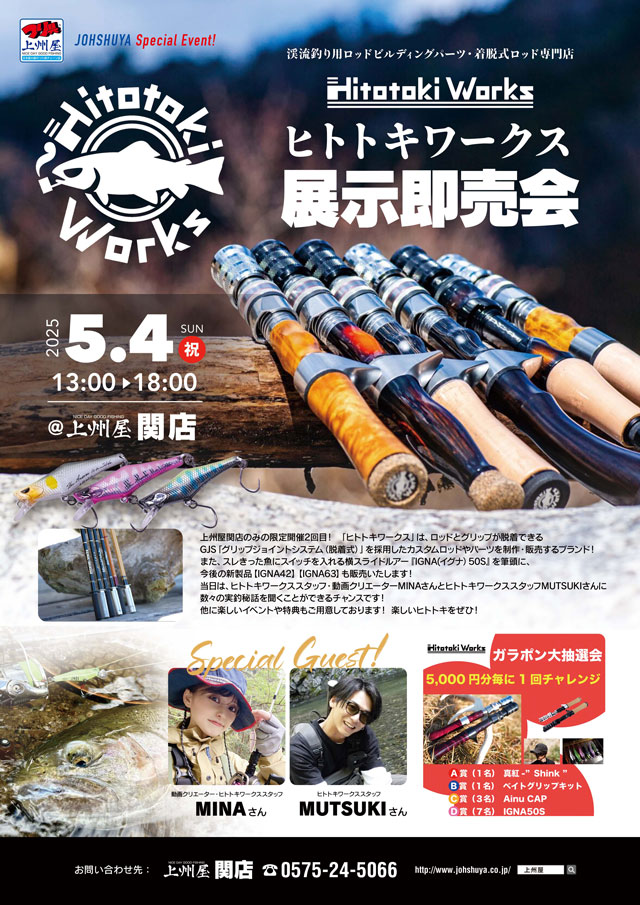 当日はロッドとグリップを脱着できる「GJS(グリップジョイントシステム)」を採用したヒトトキワークスのカスタムロッドやカスタムパーツが勢揃い!