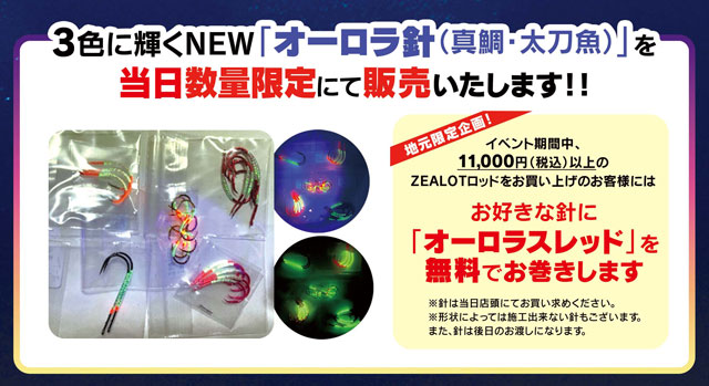 イベント期間中に税込11,000円以上のアマノ釣具「ZEALOT」ロッドお買い上げで、「ノベルティグッズ」プレゼント!さらに、お好きな針(※)に「オーロラスレッド」を無料でお巻きします!