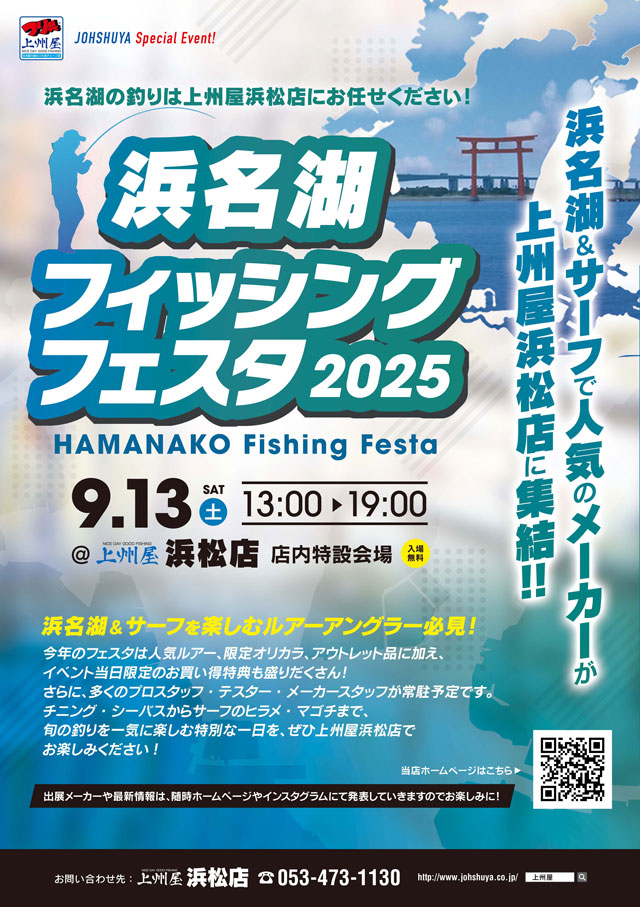 2025年9月13日(土)13:00~19:00、上州屋浜松店に浜名湖&サーフで人気のメーカーが集結!浜名湖フィッシングフェスタ2025を店頭開催します!