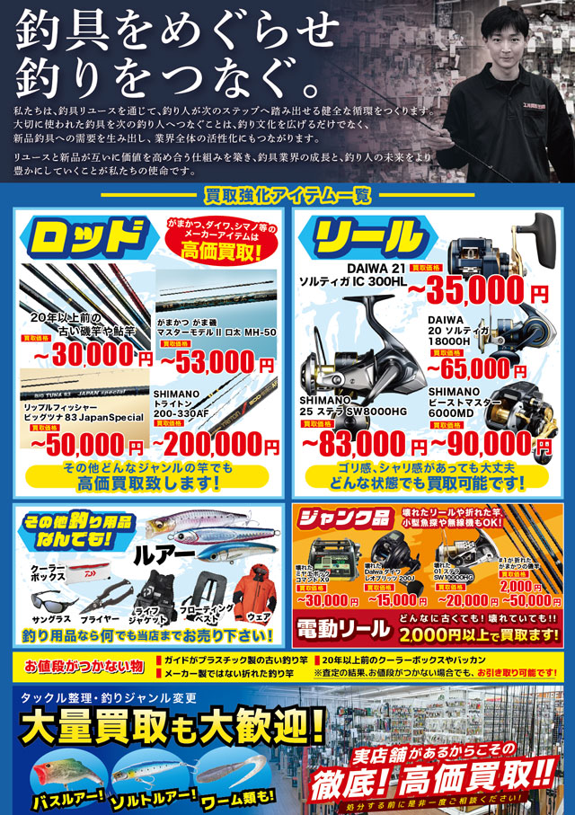 2026年1月17日(土)&18日(日)2日間の各日10:00~18:00、上州屋浜松店にて釣具高く買います!「上州屋×買取王国コラボ、出張買取イベント」を期間限定!店頭開催いたします!