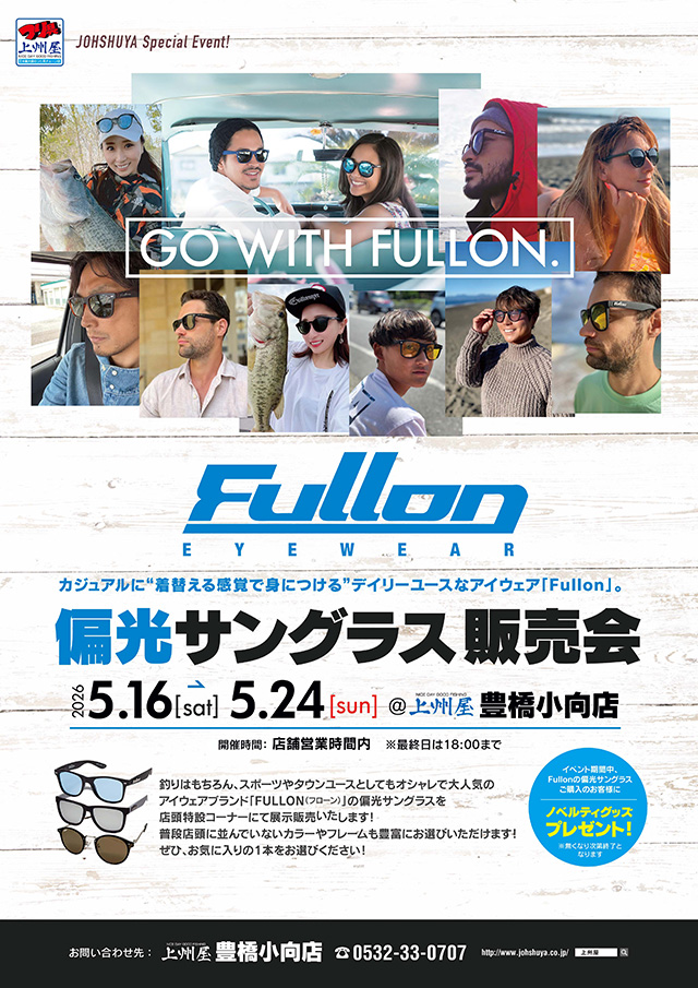 2026年5月16日(土)~24日(日)の9日間、上州屋豊橋小向店にてFullon(フローン)偏光グラスの展示販売会を開催します!