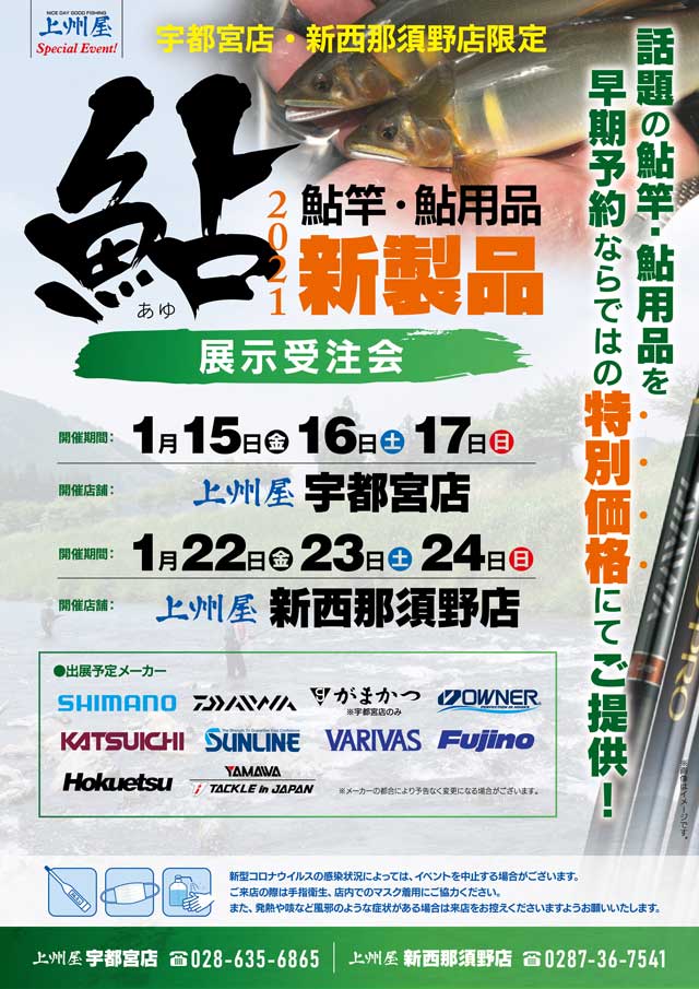 2021年度、宇都宮地区での鮎用品新製品展示受注会は、新型コロナウイルス感染症拡大防止の観点から「ろまんちっく村ローズハット」での開催は見送らせて頂き、期間と会場を分散しての店頭開催とさせて頂くことになりました。