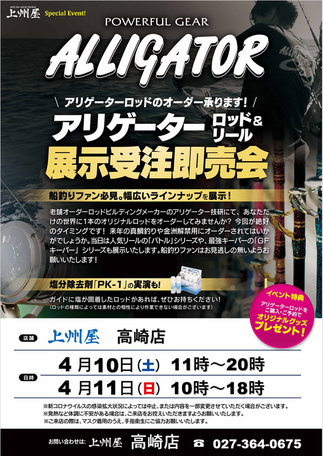 上州屋高崎店にてグラスワンピースロッドの元祖、アリゲーターロッドの展示即売会を開催します!