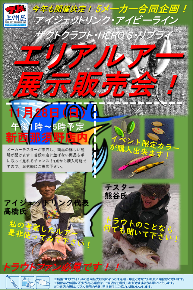 2021年11月28日(日)13:00~17:00(予定)、上州屋新西那須野店にエリアトラウトの人気メーカー5社が集結!アイジェットリンク・ザクトクラフト・アイビーライン・ヒーローズ・リプライ(順不同)による合同展示販売会を開催します!
